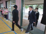 今にも雨が降り出しそうな曇り空の日、体育館で離任式が行われました。