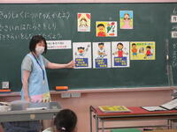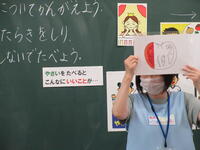 今日の1年生の学級活動では、給食センターの先生をお迎えして、食育「すききらいしないでたべよう~やさいについて~」を行いました。